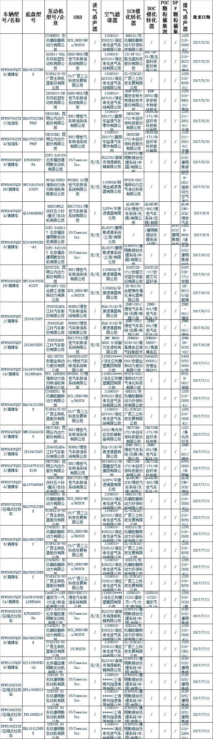 | HTW5180ZYSE/壓縮式垃圾車 | EQ1181LJ9BDE | ISB180 50 東風康明斯發(fā)動機有限公司 | 15/Cummins Inc. | / | 1109010-******/湖北申龍進氣系統(tǒng)有限公司 | SCRV025/康明斯排放處理系統(tǒng)(中國)有限公司 | / | / | / | 1205210-LD0401/東風康明斯排放處理系統(tǒng)有限公司 | 2017/7/11 |